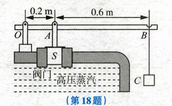 18. 如图所示为某高压蒸汽压力控制装置的示意图。当阀门$S$(底面积为$2cm^2$)受到的蒸汽压力超过其安全值时,阀门就会被顶起,从而释放一些蒸汽来降低压力,该装置相当于一个杠杆。杠杆的平衡条件是
