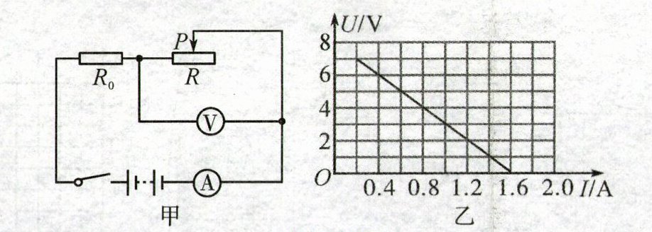 15. 如图所示的电路中,$R$为滑动变阻器,$R_0$为定值电阻,电源电压为$8V$且恒定不变(不计温度对电阻的影响)。在滑片$P$移动的过程中,电压表与电流表的示数变化如图乙所示。据图可知,下列选项中,错误的是(