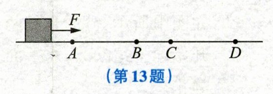 13. 物块在水平拉力$F$(大小未知)的作用下,在水平直线轨道上运动(如图所示),其中$AB = CD = 10m$。已知物块在$AB段和CD段分别以2m/s和5m/s$的速度匀速运动,且在$AB$段、$CD段所受摩擦力分别为1N和2N$。下列判断中,正确的是(
