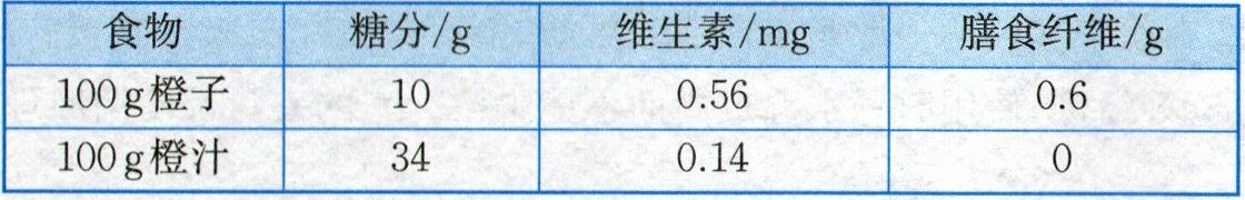 (3)相同质量的果汁比水果的含糖量高很多,且果汁中维生素含量较低,不含膳食纤维