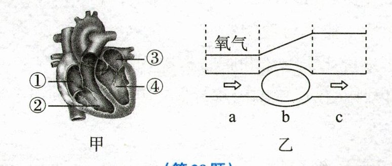 (填图甲中的序号)。(2)血液流经人体某器官b时,血液中氧气的含量发生了如图乙所示的变化(箭头表示血流方向),则血管c的名称是