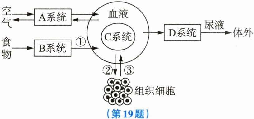 19. 如图所示为人体部分系统的生理活动模式简图,图中①表示某种生理过程,②、③分别表示两种气体,请据图分析并回答下列问题:
