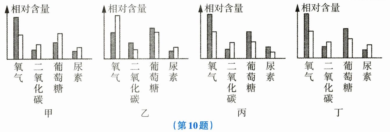 10. 如图所示为某人饭后约30min时,进出人体大脑、肾脏、小肠以及肺的血液内四种物质的相对含量。下列描述中,正确的是(