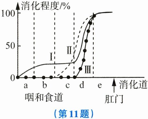 11. 如图所示的曲线表示淀粉、蛋白质、脂肪在消化道中被消化的程度。下列叙述中,错误的是(