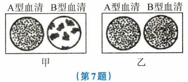 7. 如图所示为甲、乙两名同学的血型检验示意图。关于两者的血型,下列判断中正确的是(