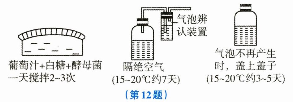 12. 如图所示简要表示了葡萄酒的酿制过程。葡萄酒的制造原理如下:先进行有氧呼吸以增加酵母菌数;然后通过无氧呼吸获得葡萄酒。关于葡萄酒的制造过程,下列叙述中不正确的是(