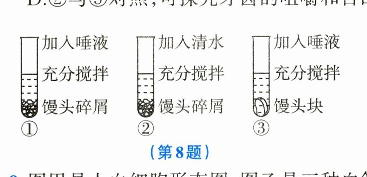 8. 如图所示为“探究馒头在口腔中的变化”的实验设计,图中试管均置于37℃的温水中10min。下列说法中,正确的是(