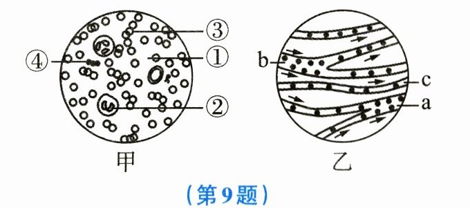 9. 图甲是人血细胞形态图,图乙是三种血管中血液流动的示意图。下列叙述中,错误的是(