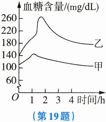 19. 如图所示,预先测定甲、乙两人空腹时的血糖含量,然后让他们饮用等量的葡萄糖溶液,并在3.5h内每隔半小时测定两人的血糖含量,所得结果如图所示。
