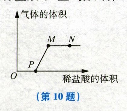 10. 将一定量的氢氧化钙溶液与碳酸钠溶液混合,充分反应后过滤,向滤液中滴加稀盐酸,产生气体的体积与加入稀盐酸的体积关系如图所示。下列说法中,不正确的是(