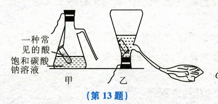 13. 用简易酸碱灭火器(如图甲所示)进行了灭火操作,如图乙所示。对瓶中残留液的成分进行探究,实验操作和现象如下:①取少量残留液于试管中,滴加 2 滴紫色石蕊试液,溶液变红;②另取少量残留液于试管中,滴加适量氯化钡溶液,有白色沉淀生成。上述实验说明残留液中有大量的(