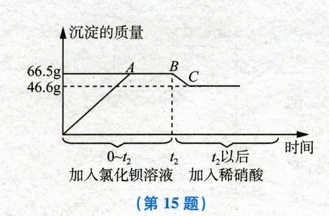 15. 某碳酸钠固体样品中,可能含有硫酸钠、碳酸钙、硫酸铜、氯化钠、氯化钙中的一种或几种杂质。为了确定杂质的成分,某兴趣小组的同学进行以下实验:第一步:取一定量样品溶于水得到无色溶液;第二步:向第一步得到的无色溶液中,先后逐滴加入过量的氯化钡溶液和过量的稀硝酸。产生沉淀的质量与时间的关系如图所示。下列说法中,正确的是(