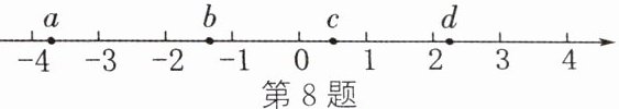 8. 有理数$a$,$b$,$c$,$d$在数轴上的对应点的位置如图所示,这四个数中,绝对值最大的是(
