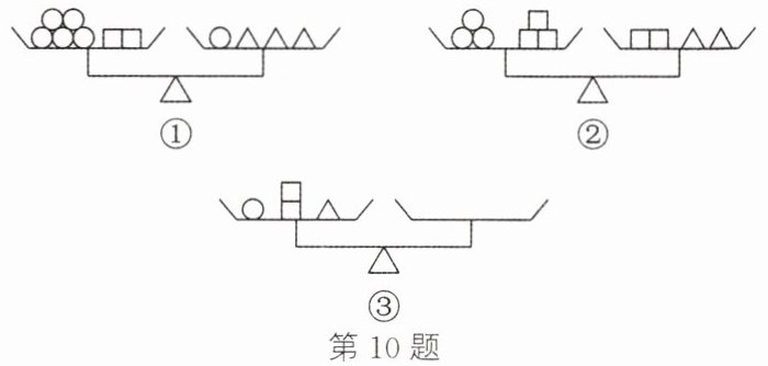 10. (新考向·代数推理)已知三个天平的托盘中形状相同的物体质量相等。如图①②所示的两个天平处于平衡状态。要使图③中的天平也保持平衡,则需在它的右盘中放入(
