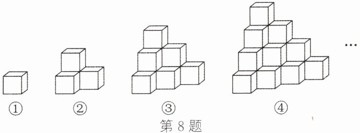 8. (新考法·探究题)如图所示为由棱长为1的正方体搭成的立体图形,第①个图形由1个正方体搭成,第②个图形由4个正方体搭成,第③个图形由10个正方体搭成,第④个图形由20个正方体搭成……根据这个规律,搭成第⑥个图形所需的正方体的个数是(