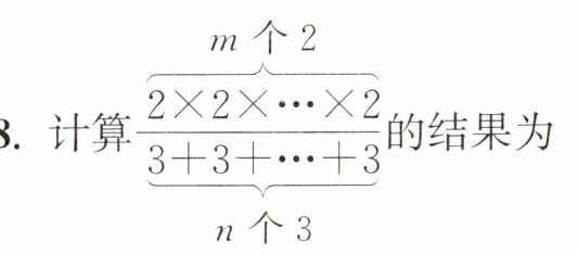 8. 计算$\frac{\overbrace{2×2×…×2}^{m个2}}{\underbrace{3+3+…+3}_{n个3}}$的结果为(