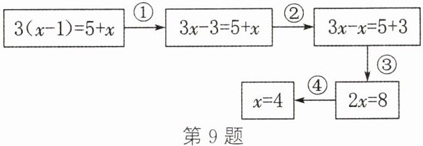 9. 如图所示的框图表示小明解方程$3(x - 1) = 5 + x$的流程,其中,步骤④的依据是(