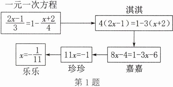 1. 小组活动中,淇淇所在小组采用接力的方式求一元一次方程的解,规则是每人只能看前面一人给的式子,并进行一步计算,再将结果传递给下一人,最后求出方程的解。过程如图所示,接力过程中,自己负责的一步出现错误的是(