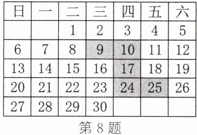 8. 如图所示为 2025 年四月份月历,用“Z”字形框出月历中的 5 个日期,这 5 个日期之和不可能是(