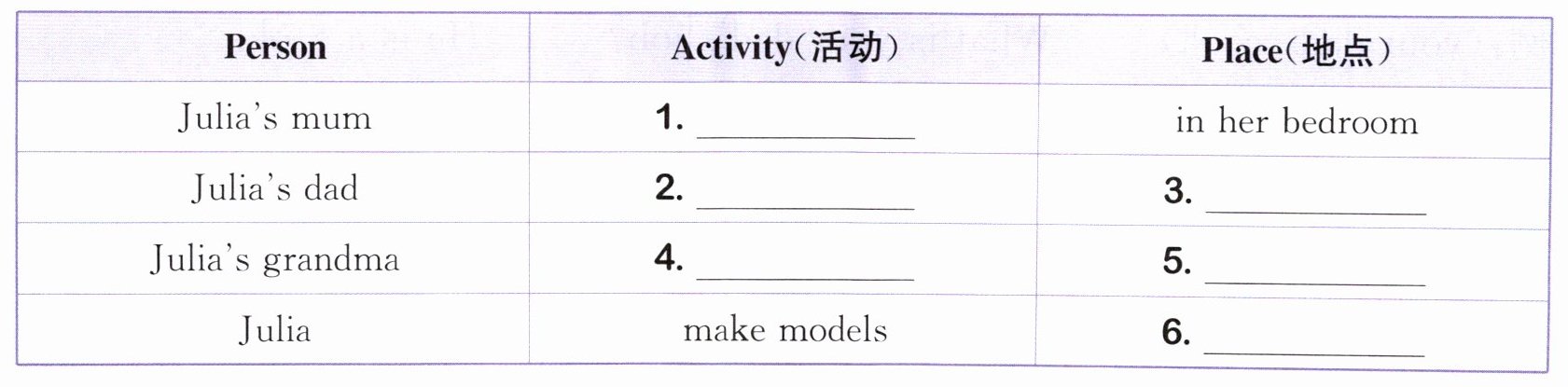 五、[新考法] Listen and complete. 听录音,根据所听短文,补全表格。