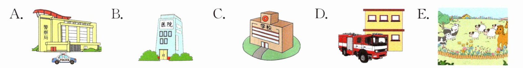 1. E;farm 2. D;fire station 3. B;hospital 4. C;school 5. A;police station
