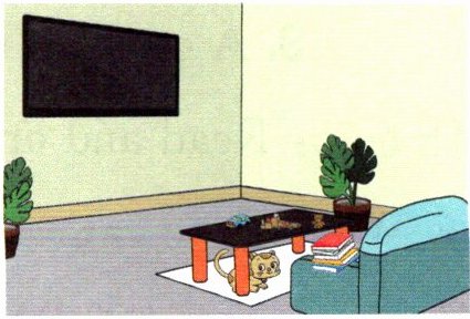 三、Look, read and complete. Amber 很喜欢画画,这是她画的她家的客厅。请你欣赏 Amber 的画,并根据上下文补全短文。
