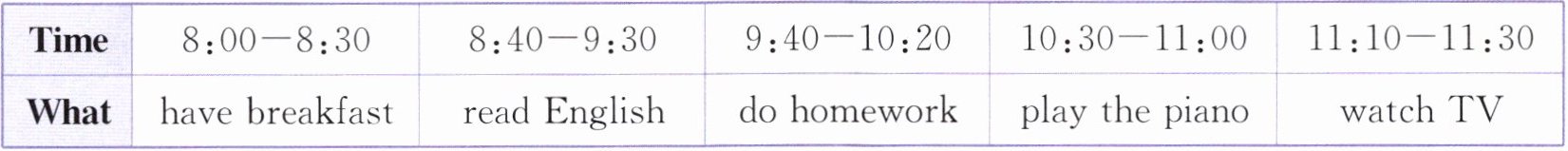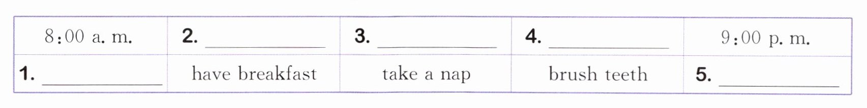 一、Look and write. Amber 卧室的墙上挂着一张周末活动时间表。根据钟面上的时间,从表格里找出合适的活动填在横线上。