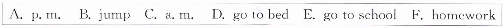 三、Read, choose and complete. Sally 的朋友 Bob 给大家分享了他一天的时间安排。从方框中选择合适的选项补全他的描述。(有一项多余)