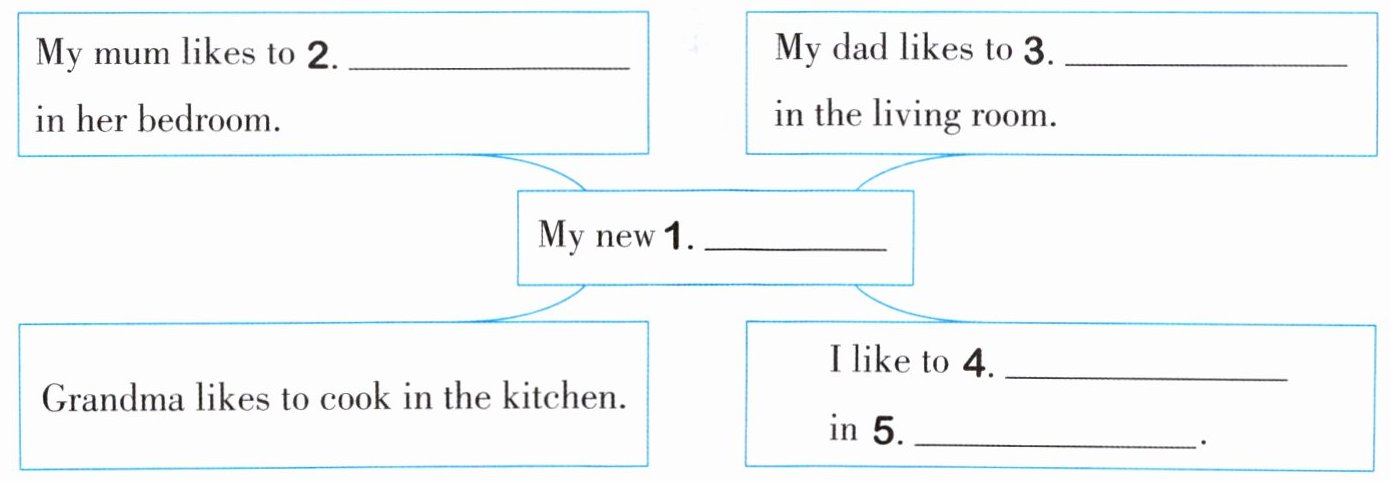1. house 2. read books 3. watch TV 4. do my homework 5. my bedroom