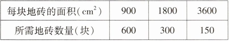 解:成反比例.理由如下:因为900×600=540000,1800×300=540000,3600×150=540000,所以每块地砖的面积×所需地砖数量=540000(一定),所以所需地砖数量与每块地砖的面积成反比例.