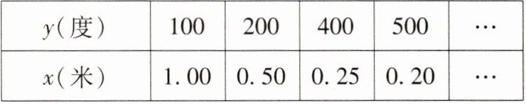 xy=100[提示:根据表格数据得近视眼镜的度数y与镜片的焦距x成反比例关系,设y与x的关系是xy=k.因为y=400时,x=0.25,所以k=400×0.25=100,所以y与x的关系是xy=100.]