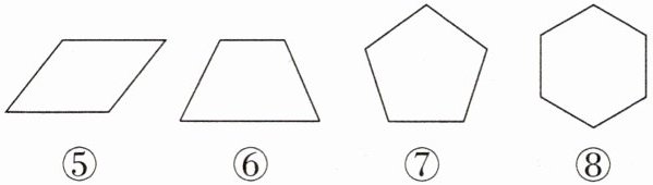 ①圆 ②三角形 ③正方形 ④长方形 ⑤平行四边形 ⑥梯形 ⑦五边形 ⑧六边形
