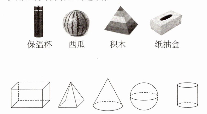 6. (教材P151思考变式)如图,上面是一些具体物体,下面是一些立体图形,找出与下面立体图形类似的实物(用线连接).