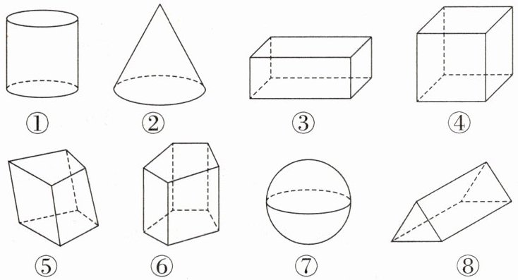 (1)①圆柱 ②圆锥 ③长方体 ④正方体 ⑤棱台 ⑥五棱柱 ⑦球 ⑧三棱柱