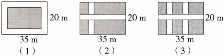 16. 某学校为美化校园,准备在长$35m$、宽$20m$的长方形场地上,修建若干条宽度相同的道路,余下部分作草坪并请全校学生参与方案设计,现有3位同学各设计了一种方案,图纸分别如图(1)(2)(3)所示(阴影部分为草坪).