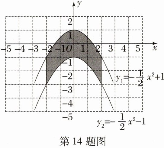 14. 两条抛物线 $ y_1 = -\frac{1}{2}x^2 + 1 $,$ y_2 = -\frac{1}{2}x^2 - 1 $ 分别经过点 $ (-2, -1) $,$ (2, -3) $,则它们与平行于 $ y $ 轴的两条平行线 $ x = 2 $,$ x = -2 $ 围成的面积 (如图阴影部分) 为 (