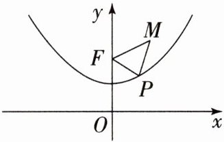 18. (素养题) 已知抛物线 $ y = \frac{1}{4}x^2 + 1 $ 具有如下性质:给抛物线上任意一点到定点 $ F(0, 2) $ 的距离与到 $ x $ 轴的距离相等,如图,点 $ M $ 的坐标为 $ (\sqrt{3}, 3) $,$ P $ 是抛物线 $ y = \frac{1}{4}x^2 + 1 $ 上一动点。