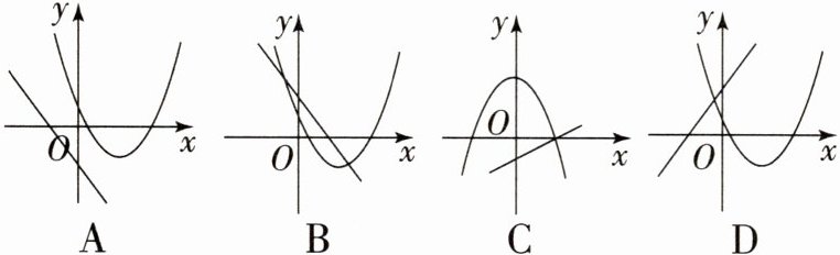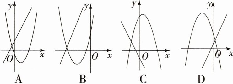 B[提示:A中,由抛物线知a>0,b<0,c<0,则ac<0,由直线知ac>0,b>0,故本选项不符合题意.B中,由抛物线知a>0,b>0,c>0,则ac>0,由直线知ac>0,b>0,故本选项符合题意.C中,由抛物线知a<0,b>0,c>0,则ac<0,由直线知ac<0,b<0,故本选项不符合题意.D中,由抛物线知a<0,b<0,c>0,则ac<0,由直线知ac>0,b>0,故本选项不符合题意.]