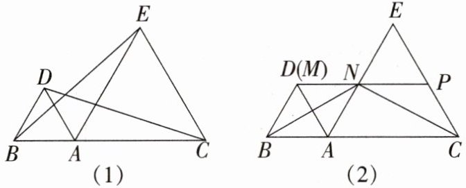 13. (教材改编题)如图(1),点 A 是线段 BC 上一点,△ABD 和△ACE 都是等边三角形.
