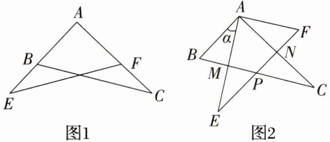 14. 某校九年级学习小组在探究学习过程中,用两块完全相同的且含 30°角(∠E = ∠C = 30°)的直角三角板 ABC 与 AFE 按如图 1 位置放置,现将 Rt△AEF 绕 A 点按逆时针方向旋转角 α(0° < α < 90°),如图 2,AE 与 BC 交于点 M,AC 与 EF 交于点 N,BC 与 EF 交于点 P.