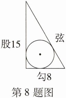 8. (数学文化)[2023·江苏镇江中考]《九章算术》中记载:“今有勾八步,股一十五步.问勾中容圆径几何?”译文:今有一个直角三角形,勾(短直角边)长为8步,股(长直角边)长为15步,问该直角三角形内切圆的直径是多少?书中给出的算法译文如下:如图,根据勾、股,求得弦长.用勾、股、弦相加作为除数,用勾乘以股,再乘以2作为被除数,商即为该直角三角形内切圆的直径,则该直径等于