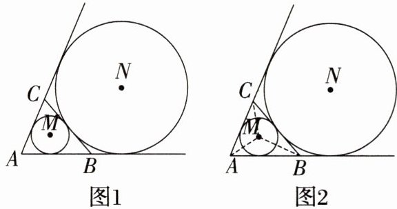 【问题探索】如图1,在△ABC中,设BC= a,AC= b,AB= c,$p= \frac{a+b+c}{2}$,⊙M是△ABC的内切圆,⊙N分别与AC的延长线、AB的延长线以及线段BC均只有一个公共点,⊙M的半径为m,⊙N的半径为n.