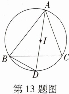 13. 如图,△ABC的内心为I,连接AI并延长交△ABC的外接圆于D,则线段DI与DB的关系是( )