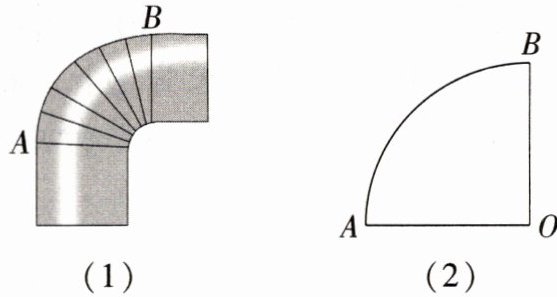 1. (2023·甘肃兰州中考)如图(1)是一段弯管,弯管的部分外轮廓线如图(2)是一条圆弧$\overset{\frown}{AB}$,圆弧的半径$OA = 20\mathrm{cm}$,圆心角$\angle AOB = 90^{\circ}$,则$\overset{\frown}{AB}$等于 (