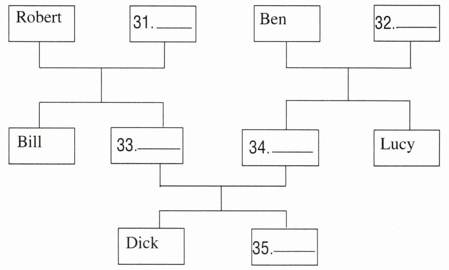 31. A[提示:推理判断题。由家谱及句子 My mother's name is Nancy. 可推知,31 空是 Bruce 的母亲 Nancy,故选 A。] 32. C[提示:推理判断题。由家谱及句子 My wife's mother's name is Sarah. 可推知,32 空是 Bruce 妻子的母亲 Sarah,故选 C。] 33. C[提示:推理判断题。由家谱及句子 Bill is my brother. 可知,33 空是 Bruce,故选 C。] 34. D[提示:推理判断题。由家谱及句子 Lucy is my wife's sister. 可推知,34 空是 Bruce 的妻子 Allen,故选 D。] 35. B[提示:推理判断题。由家谱及句子 And Linda is my daughter. 可知,35 空是 Bruce 的女儿 Linda,故选 B。]