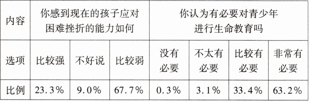 (1)①超过一半的人认为现在的孩子应对困难挫折的能力比较弱。②绝大多数人认为有必要对青少年进行生命教育。 (2)示例:当我遇到困难挫折时,我希望家长能在我身边。家长的力量如同普照大地的阳光,温暖而直接,让我在挫折面前不再感到孤独和迷茫。