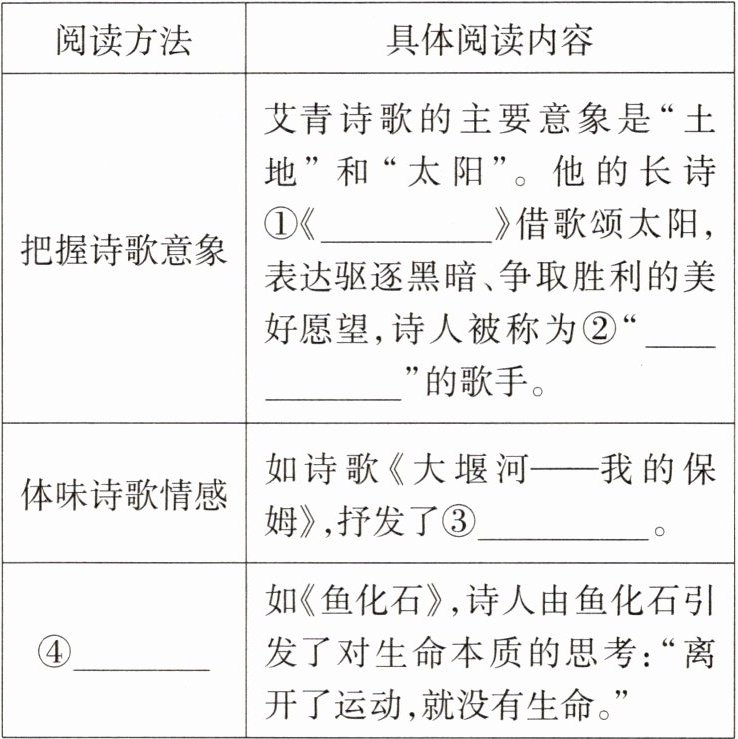 (2)①《向太阳》 ②太阳与火把 ③对抚养自己的保姆深深的挚爱和无尽的怀念 ④体会诗歌的理性美