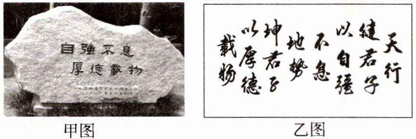 (1)清华大学的校训“自强不息,厚德载物”出自《易经》,原文是:“天行健,君子以自强不息;地势坤,君子以厚德载物。”甲图是清华校园里的碑刻作品,乙图是书法作品。请指出它们各属于什么字体。