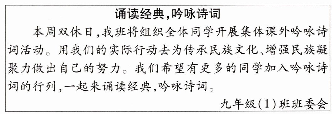 14. (原创)诗词是中华文明智慧的积淀。为了传承民族文化,增强民族凝聚力,学校决定开展“诵读经典,吟咏诗词”活动,为此,九年级(1)班将举行课外吟咏诗词活动。请你按要求完成下面任务。(新考向·文化传承)