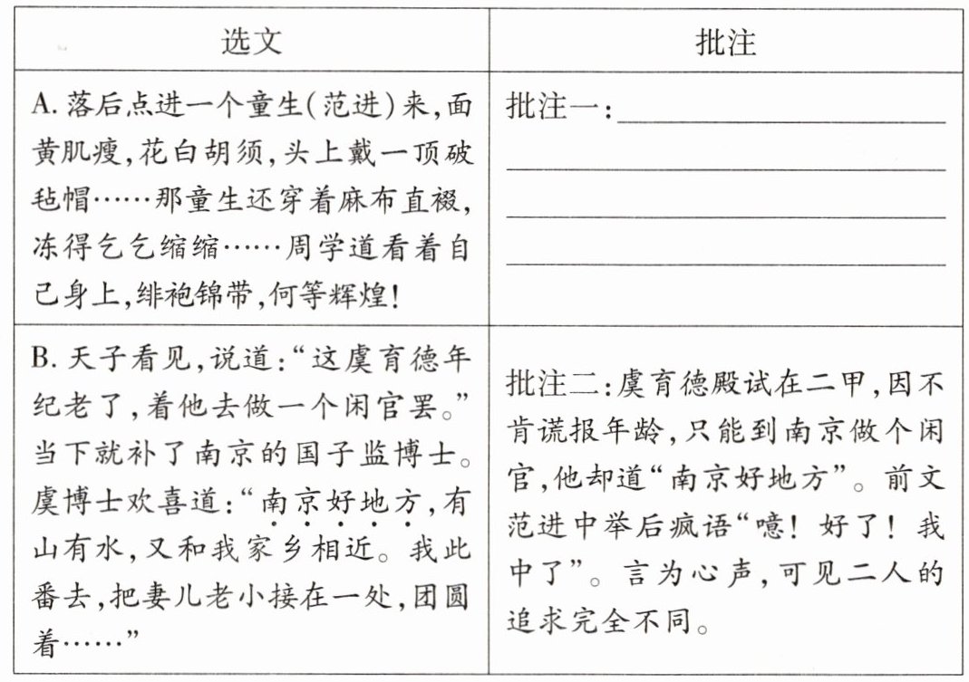 (2) 阅读批注二,联系名著比较虞育德与范进的追求有何不同,作者塑造这两类人物的目的是什么?